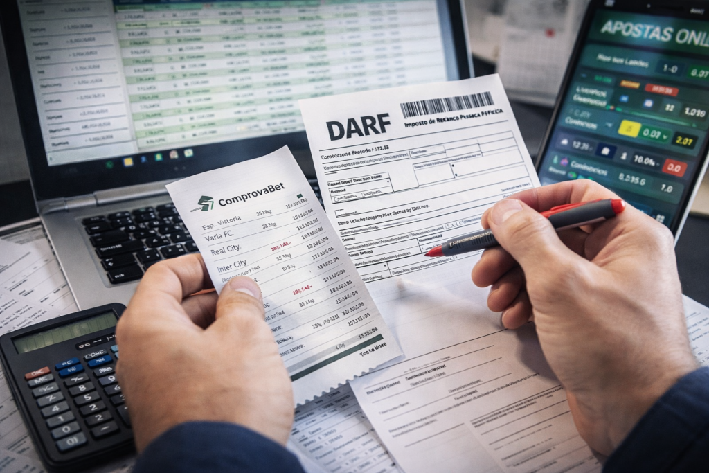 A própria Receita lançou uma ferramenta digital para ajudar o contribuinte a apurar a base de cálculo e o imposto devido sobre prêmios em bets e fantasy sport. O fluxo oficial é: pegar os dados do ComprovaBet, usar o aplicativo de apuração, verificar se houve imposto a pagar e, se houver, emitir o DARF. Esse roteiro reduz o risco de erro manual, principalmente para quem apostou em mais de uma marca de um mesmo operador ou misturou apostas esportivas com eventos virtuais.