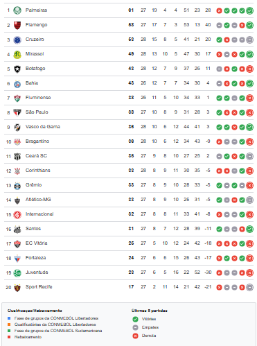 Após os jogos de 15/10, a tabela do Brasileirão ficou da seguinte forma: